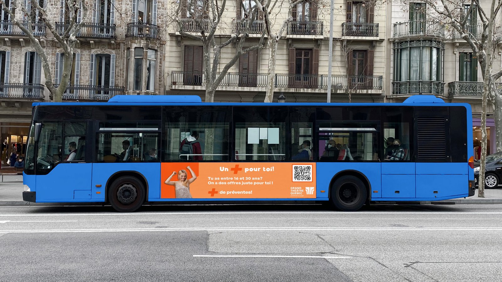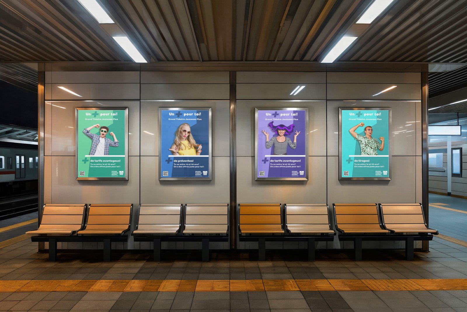 Dans le cadre du lancement du programme Grand Théâtre Jeunesse Plus (GTJ+), du Grand Théâtre Québec. Le mandat consistait à concevoir une campagne publicitaire dynamique visant à rejoindre un public jeune, âgé de 16 à 30 ans, principalement des étudiants de niveau collégial et universitaire. L’objectif était de créer une série de visuels promotionnels percutants pour les espaces urbains (abribus, métro, bus, écrans digitaux), afin de mettre en valeur les offres exclusives réservées à cette clientèle.