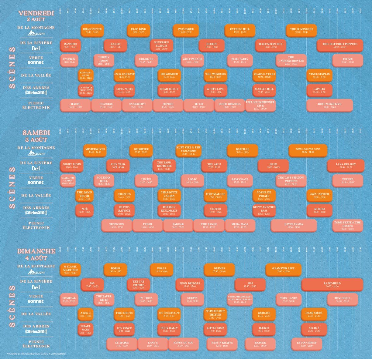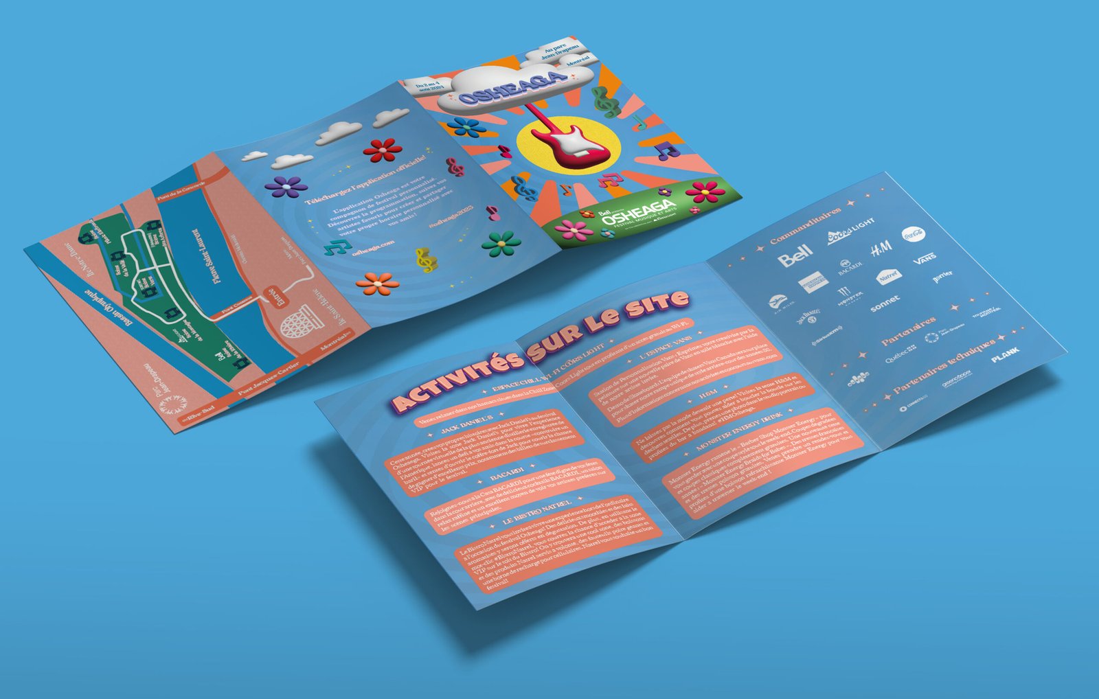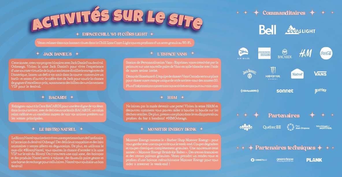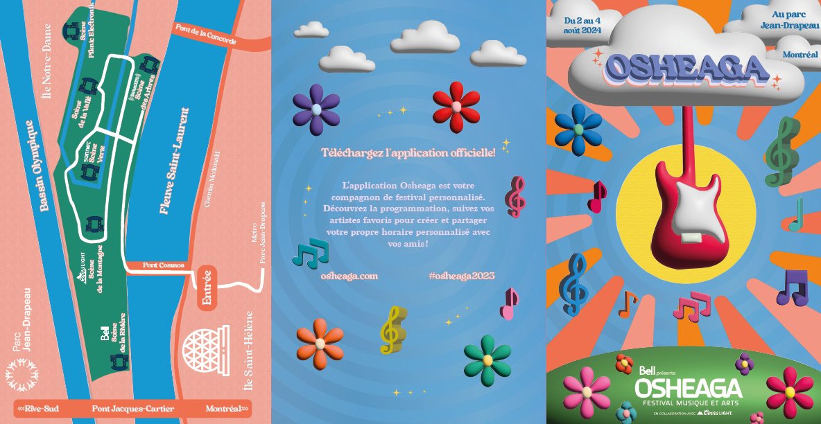 Le mandat consistait à concevoir l’identité visuelle imprimée du festival Osheaga, un événement musical et artistique majeur qui se tient chaque année à Montréal depuis 2006. Il s’agissait de créer un système illustratif cohérent et immersif, destiné à accompagner de manière harmonieuse l’ensemble des informations clés : programmation des artistes, carte du site, activités proposées et commanditaires. Ce système visuel a été décliné dans une affiche principale et un dépliant triptyque distribué pendant le festival.