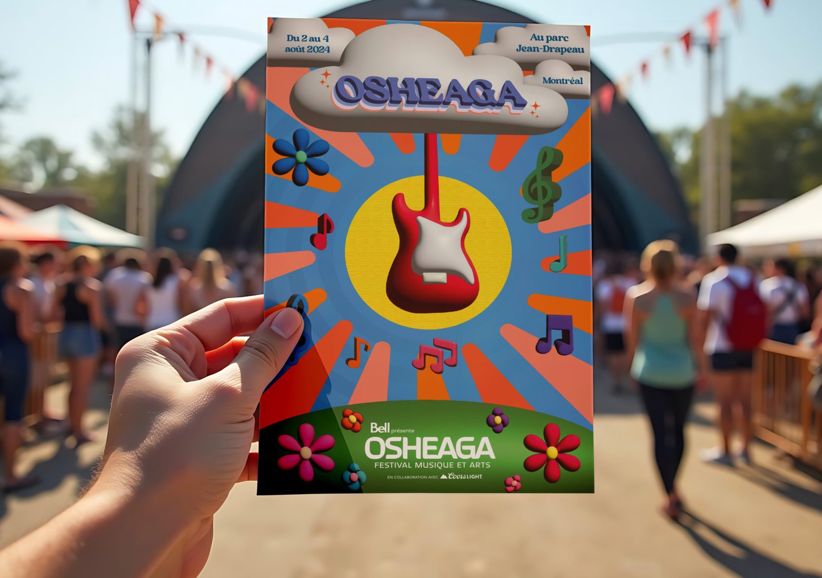 Afin de traduire l’énergie festive, artistique et inclusive du festival, le design s’inspire de l’univers graphique des années 70, combinant des éléments rétro, des textures 3D et des couleurs vives. L’élément central — une guitare suspendue à un nuage — évoque l’idée d’un festival onirique et musical, entre ciel et terre.