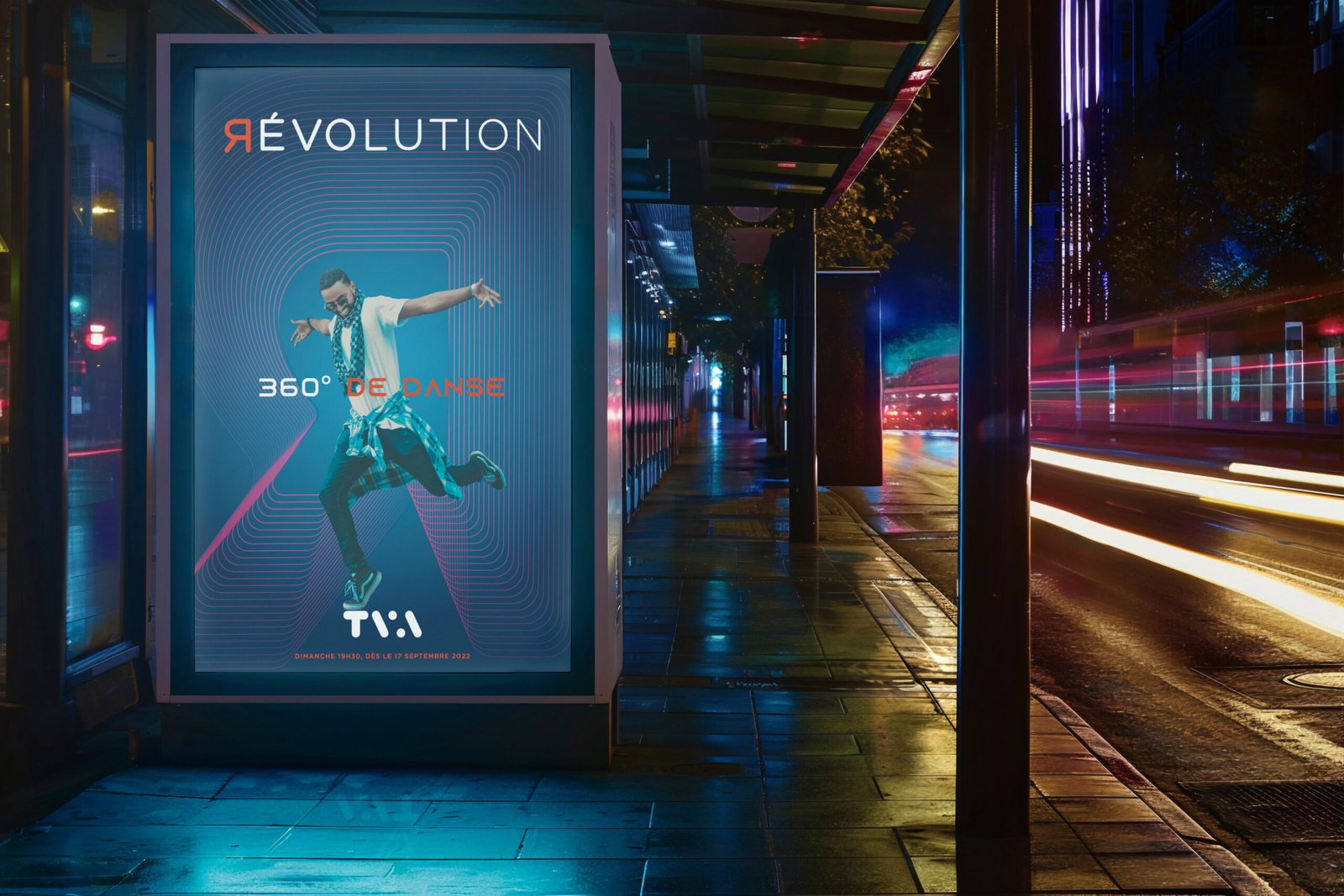 L’affiche communique de manière directe et accrocheuse grâce à son esthétique urbaine et énergétique. Le design, centré sur une figure en mouvement, génère un fort impact émotionnel, évoquant la liberté, la passion de la danse et la connexion humaine. Les lignes géométriques qui structurent la composition renforcent l’idée d’un univers en expansion où tous les styles de danse se rejoignent. Son déploiement dans l’espace public, en vitrines rétroéclairées et sur les plateformes numériques assure une grande visibilité, tout en reflétant l’esprit inclusif et vibrant de l’émission.
