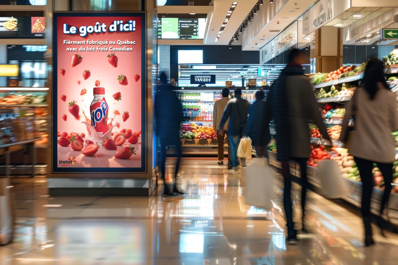L’affiche s’adapte parfaitement à différents contextes : supermarchés, mobilier urbain, affichage numérique et réseaux sociaux. Le visuel est clair, impactant et conçu pour inciter à l’achat immédiat. Le message de “produit local” renforce l’identité culturelle et la confiance envers la marque. La vidéo promotionnelle de la campagne “Le goût d’ici!” propose une expérience sensorielle qui allie dynamisme visuel et fierté locale. En quelques secondes, une pluie de fraises fraîches entoure la bouteille de YOP, surgissant d’une vague de lait symbolisant ses origines canadiennes.